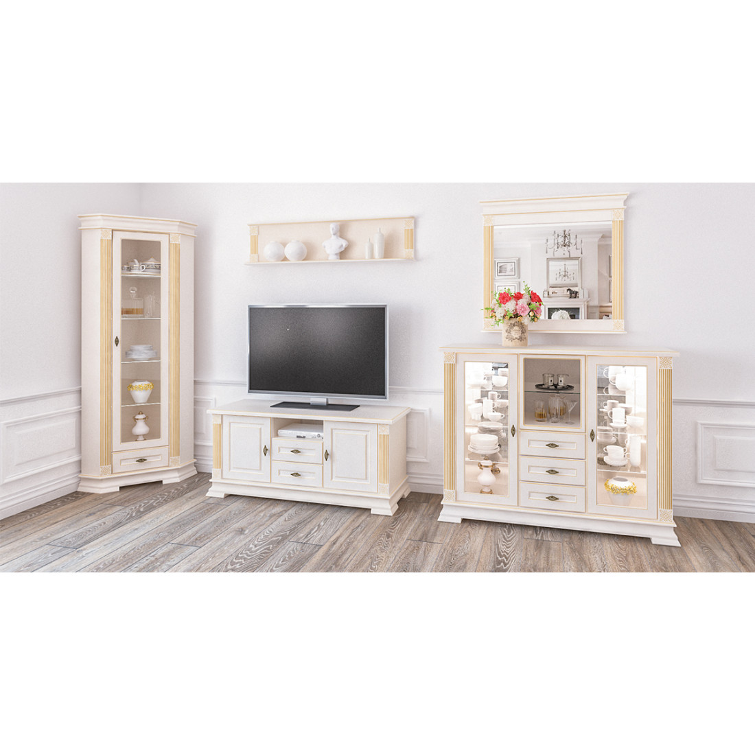 Тумба будет прекрасным дополнением к гостиной в классическом интерьере.